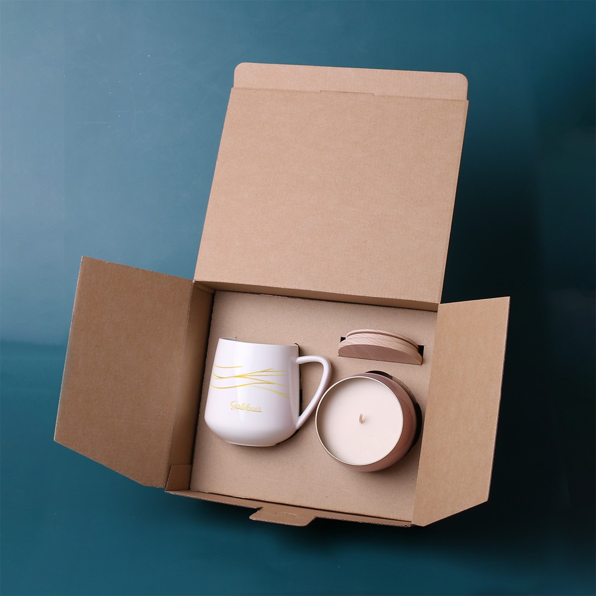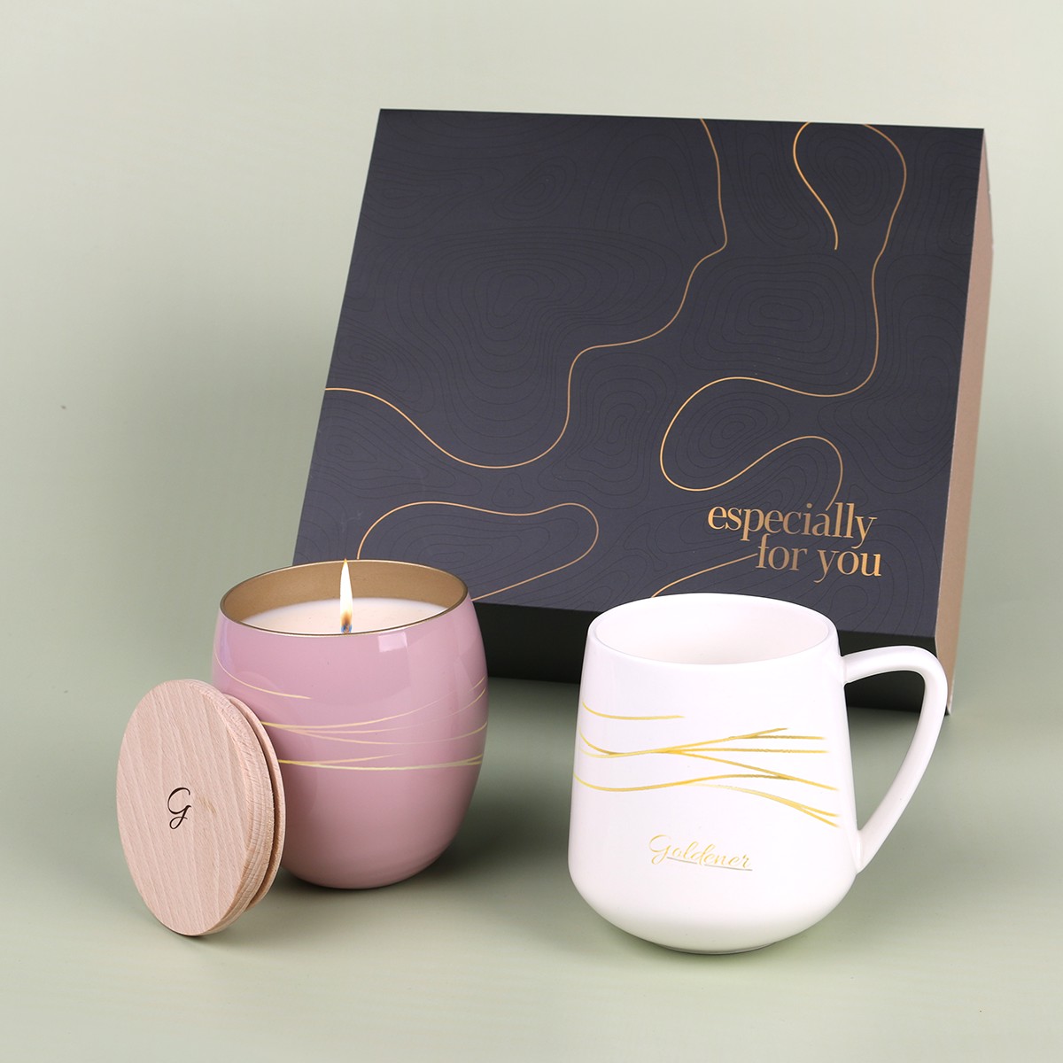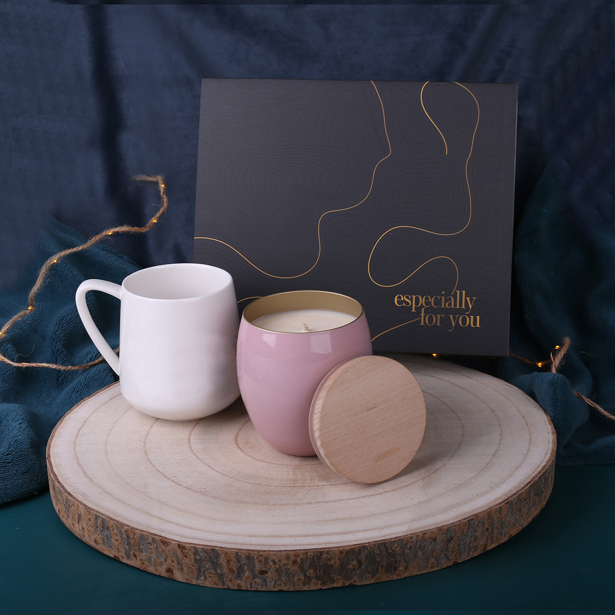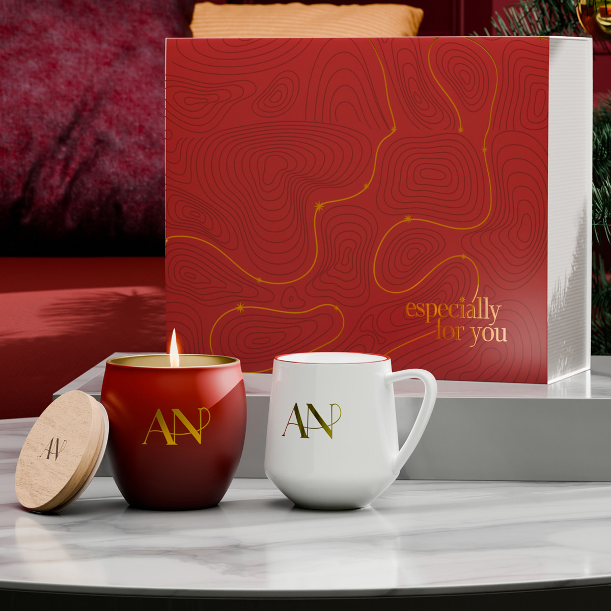 The delicate Eris porcelain mug paired with the customizable, eco-friendly Glamour candle filled with soy wax. The candle features a wooden lid that helps preserve the scent longer, and can also be branded. The set is packed in dedicated eco-friendly Snowy packaging and finished with an elegant personalized band. THE PRESENTED DECORATION IS FOR ILLUSTRATION PURPOSES ONLY AND IS NOT INCLUDED IN THE PRODUCT PRICE. THE SET IS AVAILABLE IN DEDICATEDSNOWY PACKAGING WITH A SELECTED DECORATION OPTION.