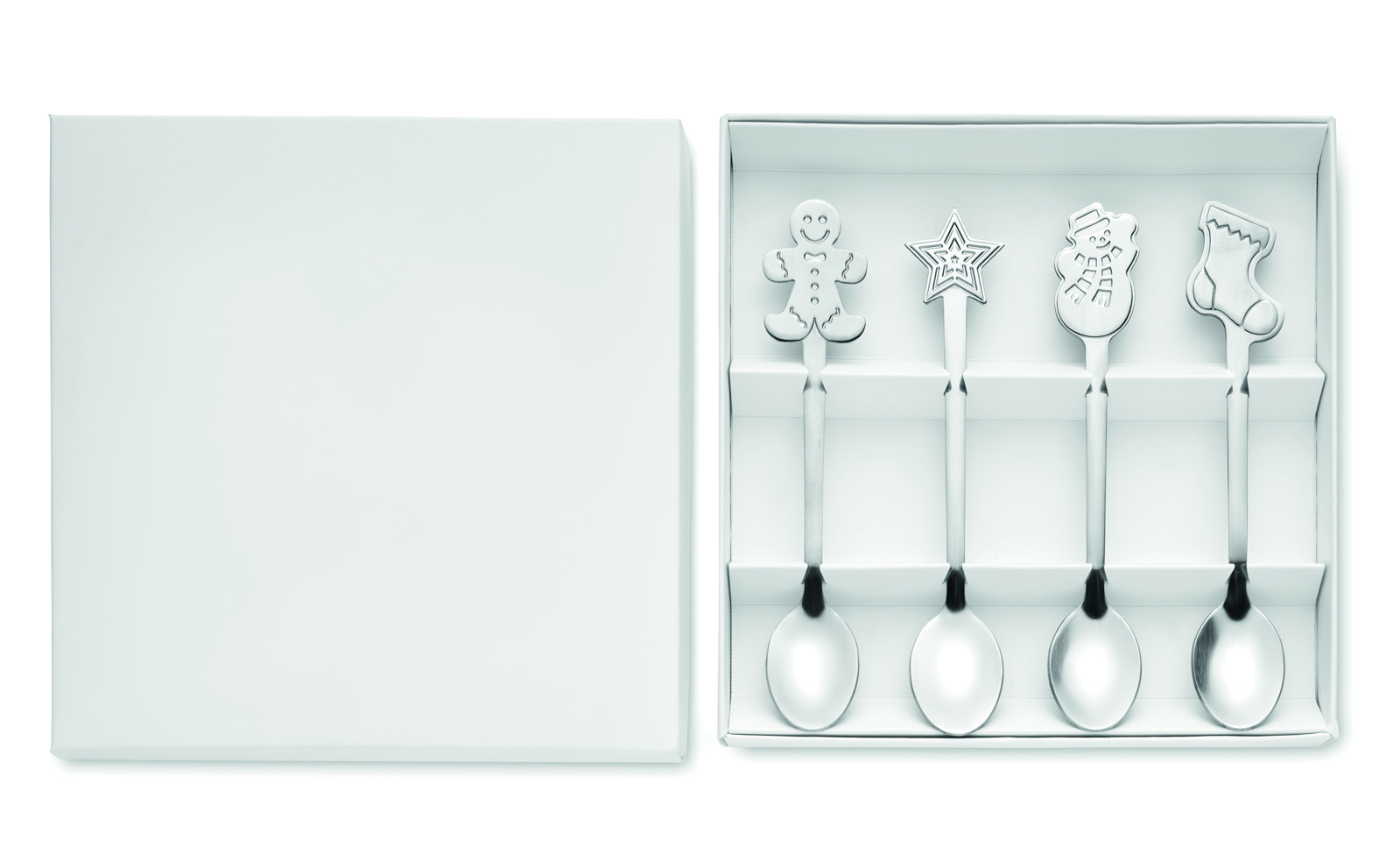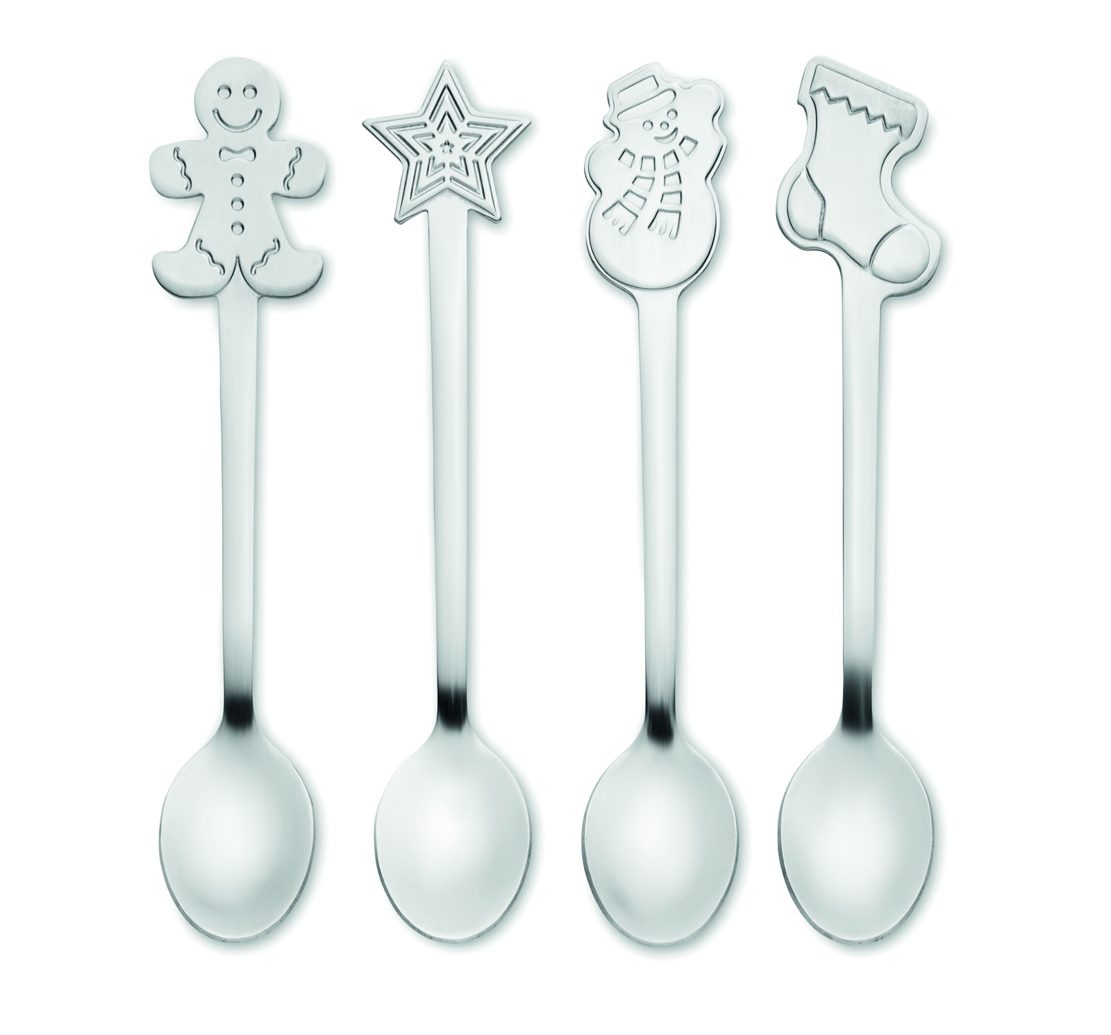 Set of 4 different stainless steel Christmas motif tea spoons. Presented in giftbox.