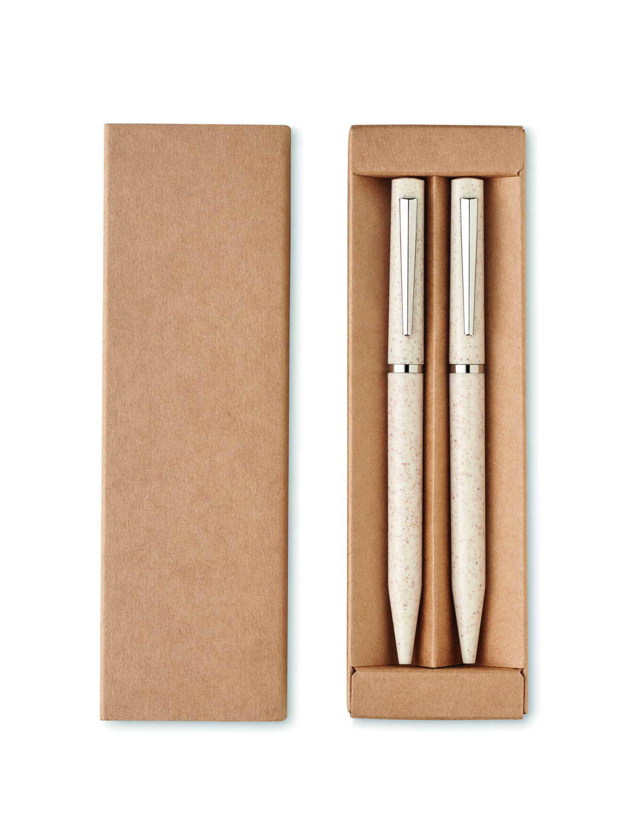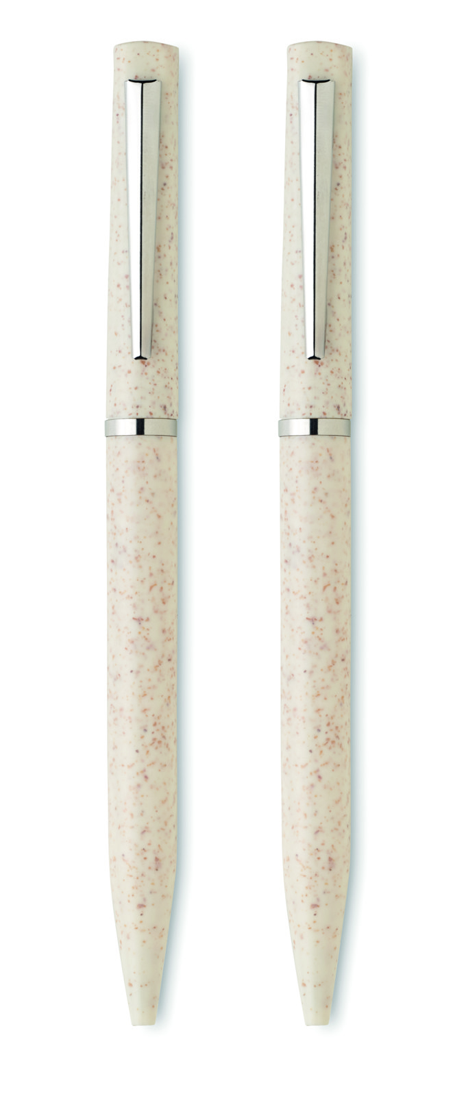 Komplet je izdelan iz mešanice pšenične slame in ABS-a in vključuje en vrtljivi kemični svinčnik z modrim črnilom in eno vrtljivo grafitno pero brez črnila, ki zagotavlja oboje sodobne in klasične izkušnje pisanja. Vsak komplet je lično predstavljen v škatli iz recikliranega papirja, ki daje močno ekološko sporočilo, ki ga bodo vaši prejemniki cenili.