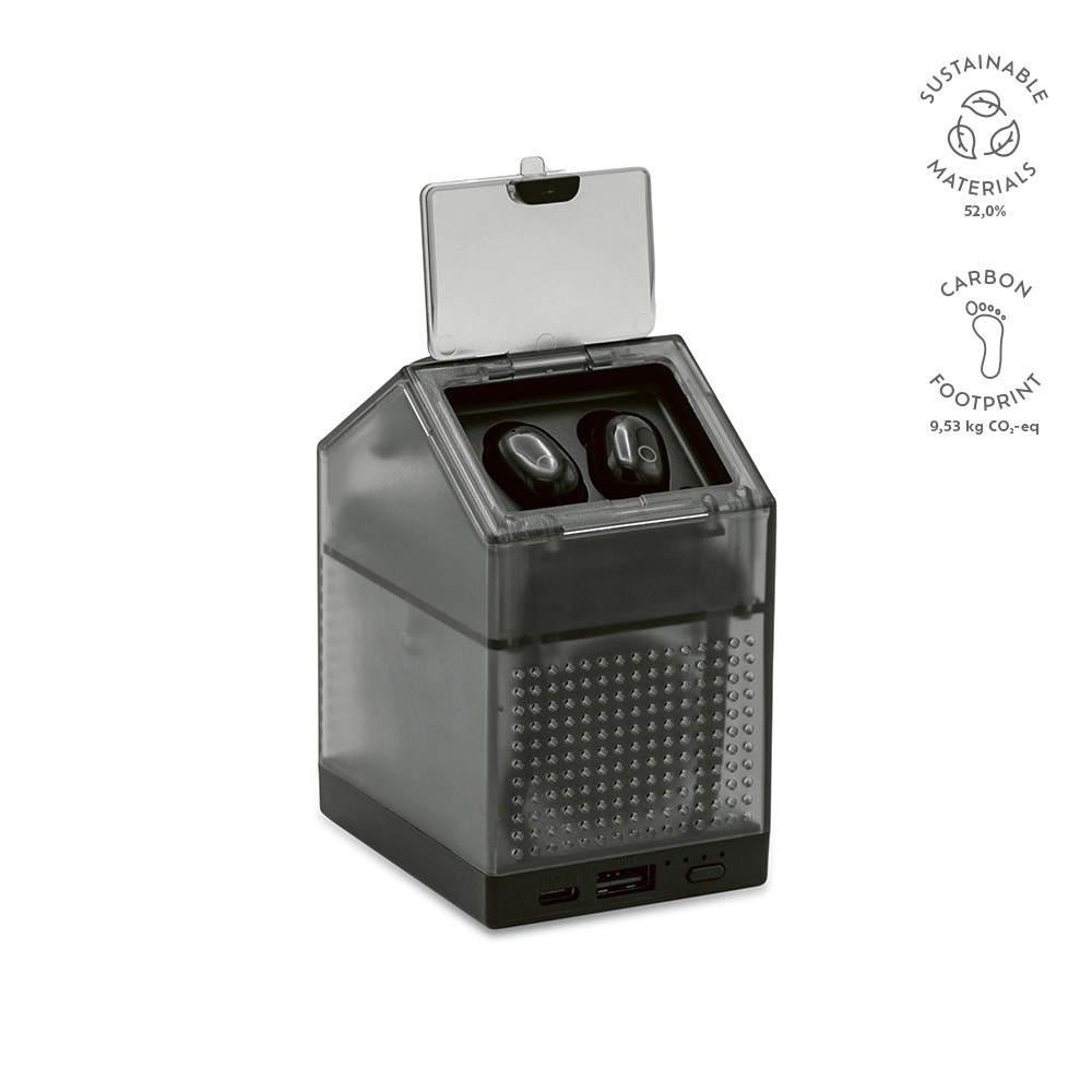 To izjemno poslovno darilo vključuje napredno tehnologijo TWS (True Wireless Stereo) za impresiven zvok, skupaj z 5 W zvočnikom, ki ponuja več kot 5 ur predvajanja — kot nalašč za vsakodnevno uporabo ali zabavo na poti. Poleg tega je izdelan iz recikliranega ABS-a, kar je v skladu s cilji trajnosti in zmanjša njegov odtis CO2 na samo 8,94.