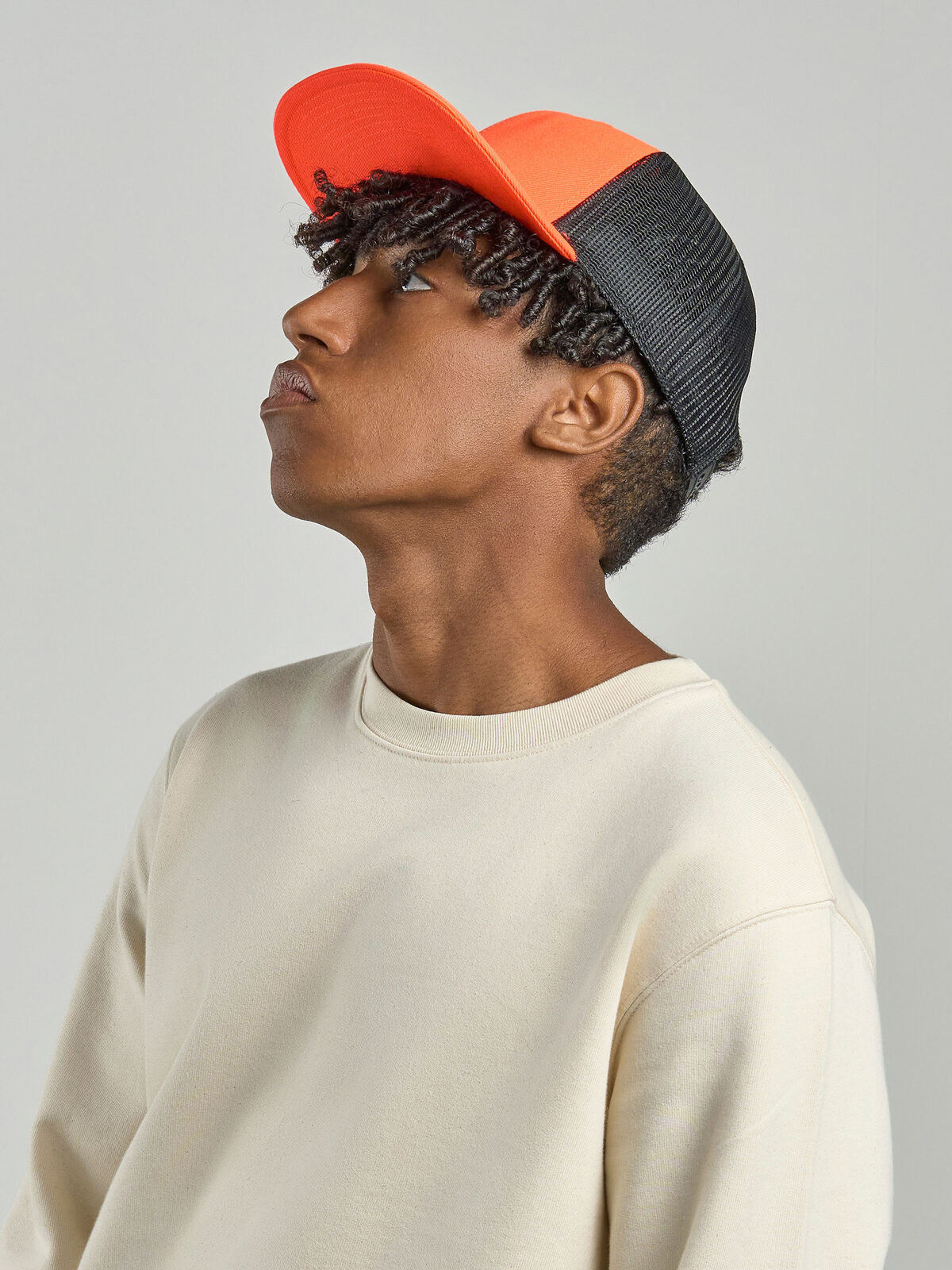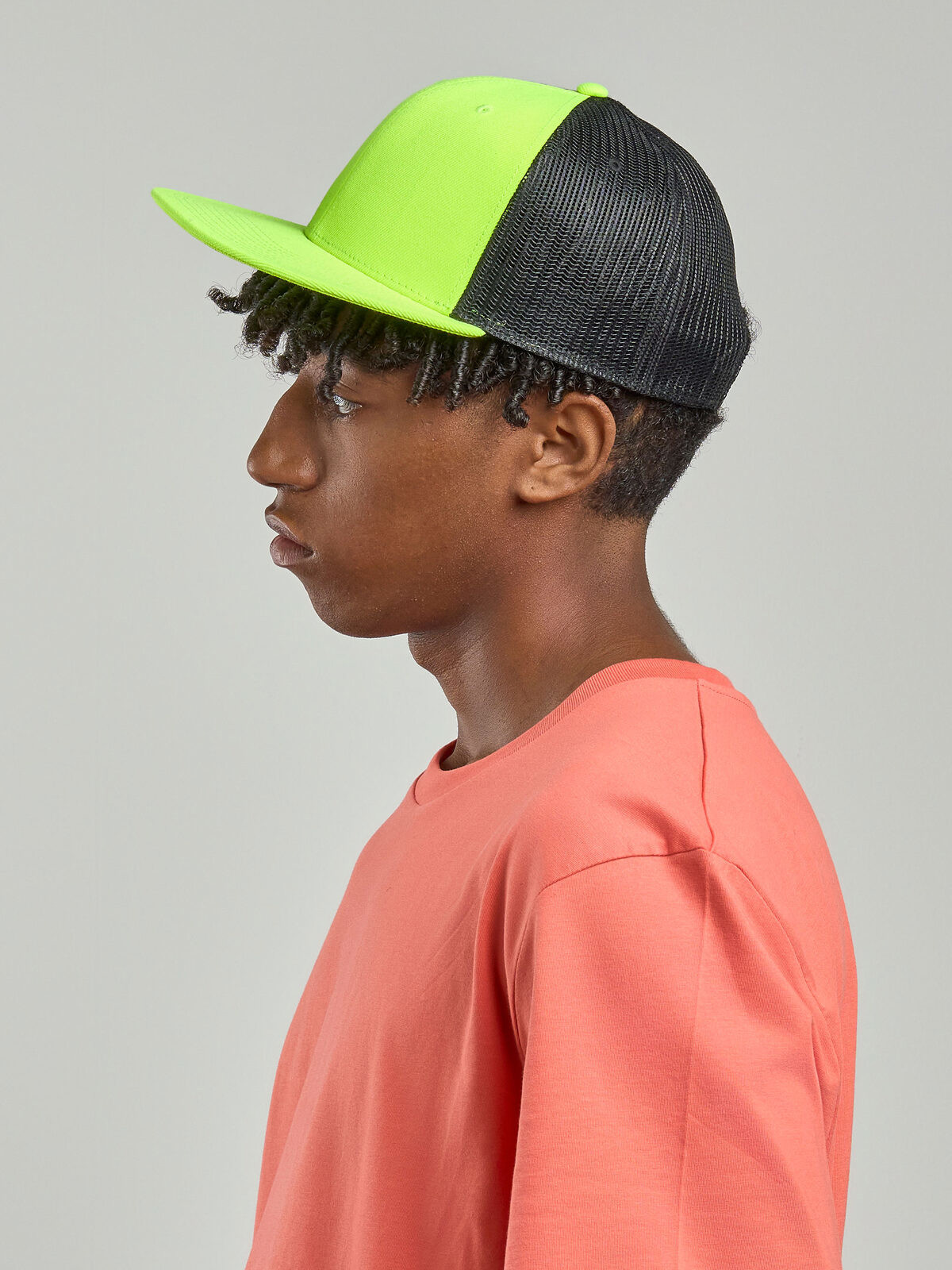 100% recycled polyester. Recycled polyester 6-panel hat, flat visor, recycled polyester side and back mesh, PVC snapback closure. Removable label.