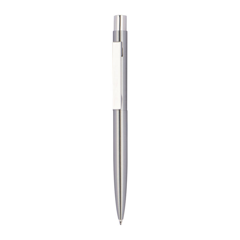The elegant silver metal ballpoint pen by MoLu is distinguished by its superior craftsmanship using recycled metal and its matt brushed finish, which imparts a luxurious appearance and tactile experience. The chrome-coloured clip and click mechanism add further sophistication and functionality to the design. Equipped with a Parker large-capacity refill, the MoLu ballpoint pen delivers a smooth and comfortable writing experience, ideally suited for extended writing sessions. The refillable feature allows for effortless replacement of the ink cartridge, ensuring this pen remains a durable companion. This renders the MoLu ballpoint pen an ideal personalised gift or a premium promotional item for your company. Presented in exclusive gift packaging with a 2-year warranty.