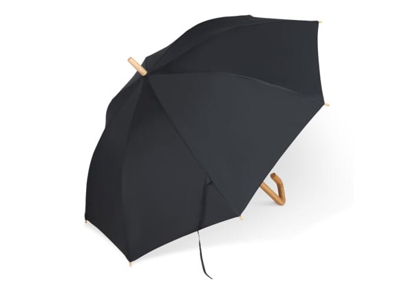 23-palčni samodejno odpirajoč dežnik iz poliestra 190T z leseno gredjo, konicami in vrhom. Črno prevlečena kovinska rebra. Lesen ročaj ukrivljenega naravnega zaključka.