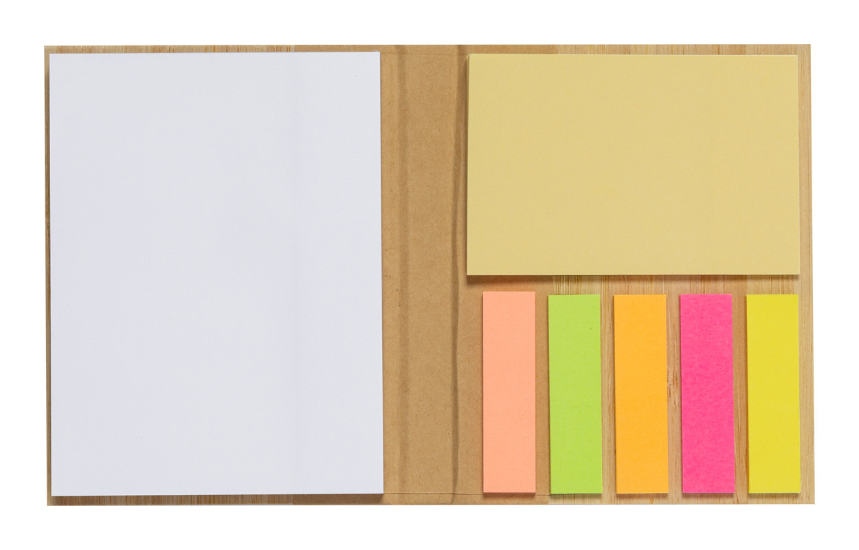 Bamboo covered notepad with 70 sheets, 25 sticky notes and 125 page markers (in 5 different colours).