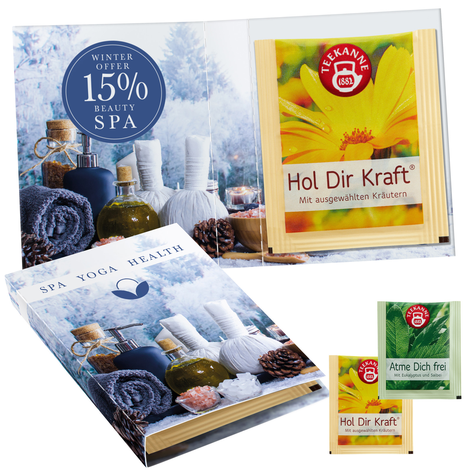 Folding card with personalised printing on the inside and the outside and practical tear-off perforation. Tea bag stucked in the inside of the card.