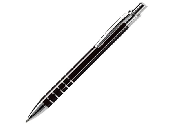 Aluminum ball pen with five rings with silver finish. Single name engraving available from orders of minimal 50 pieces. Provided with a plastic ink refill (standard: black writing ink).