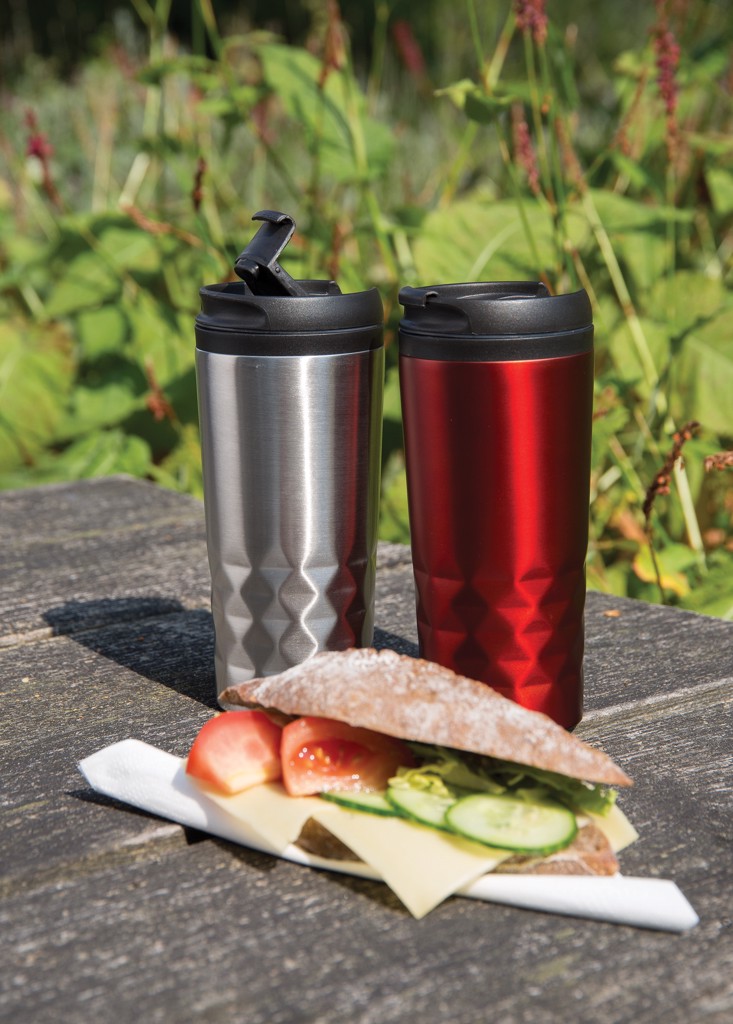 Njegov vgrajen ročaj je idealen spremljevalec na potovanjih, saj zagotavlja, da bodo vaše tople ali hladne pijače med prevozom na delo in domov. Zunanjo lupino, izdelano iz trpežnega polipropilena in nerjavečega jekla, je tudi enostavno razstaviti za recikliranje, zaradi česar je odgovorno in trajnostno promocijsko darilo. Popolnoma brez BPA in zasnovana za ročno pranje, ta skodelica odraža sodobne vrednote tako v uporabnosti kot v skrbi za okolje.
