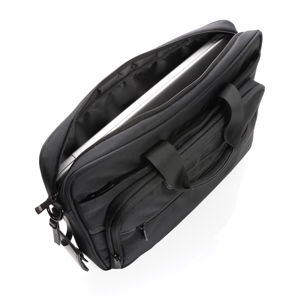Izboljšajte svojo ponudbo poslovnih daril s torbo za prenosni računalnik Swiss Peak AWARE™ RPET Voyager 15,6"— popolna mešanica ekološko ozaveščenega dizajna in profesionalnega stila. Ta torba za prenosni računalnik, zasnovana za sodobnega profesionalca, je izdelana iz vzdržljivega 1680D recikliranega poliestra z bogatimi PU poudarki, vse preverjeno s strani Tehnologija sledenja AWARE™, ki zagotavlja pristno uporabo recikliranih materialov.