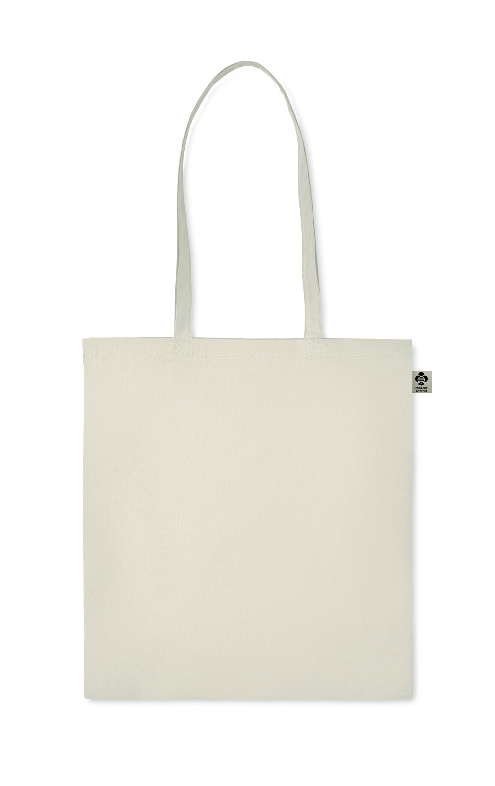 Podajte izjavo o trajnosti z vrečko iz recikliranega blaga Moira Duo 140 gr/m² – popolno poslovno ali promocijsko darilo za okolju prijazne blagovne znamke. Ta dvobarvna nakupovalna torba z vrvico, izdelana iz mešanice 80 % recikliranega bombaža in 20 % recikliranega poliestra (RPET), je oblikovana tako, da odraža zelene vrednote vašega podjetja.