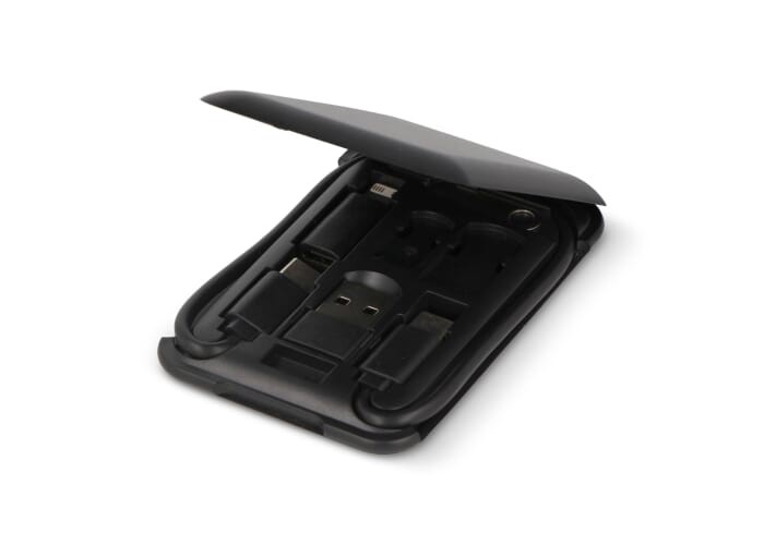 Stay connected on the go with our versatile travel kit! Multiple USB connectors ensure compatibility with all your devices. Compact, efficient, and ready for your journey. The handy integrated phone holder helps you while watching videos and else. As you may expect the item is made with recycled materials to help making a greener world.