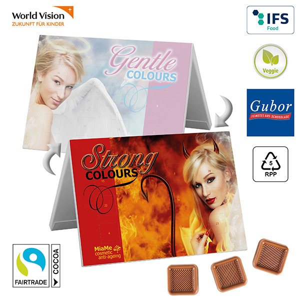 Table Advent Calendar, in horizontal format with folding device as stable foot, filled with milk chocolate, minimum 30 % cocoa, stable deepdrawn sections, 12 doors on each side.