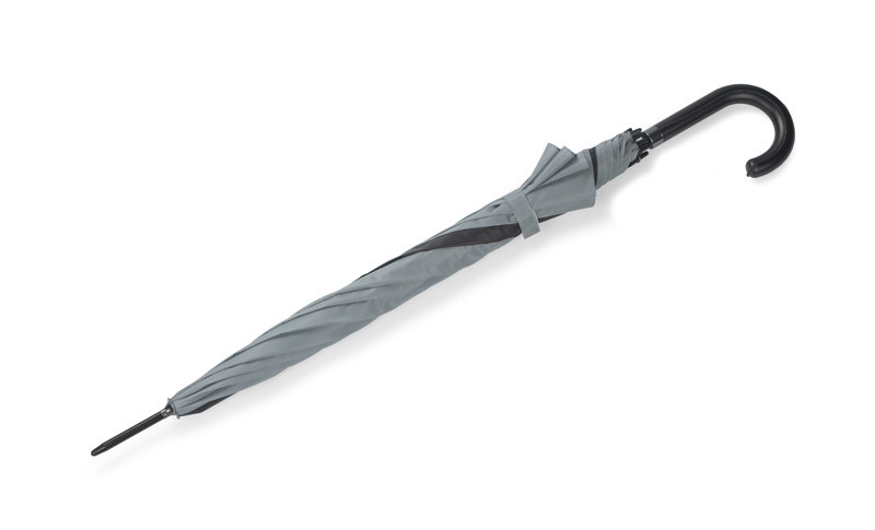 The LIF automatic Umbrella has a curved faux leather handle with elegant stitching. It is made of 190T polyester. One of the eight panels is in a distinctive color. The diameter of the bowl is 104 cm. The length of the folded umbrella is 88 cm.