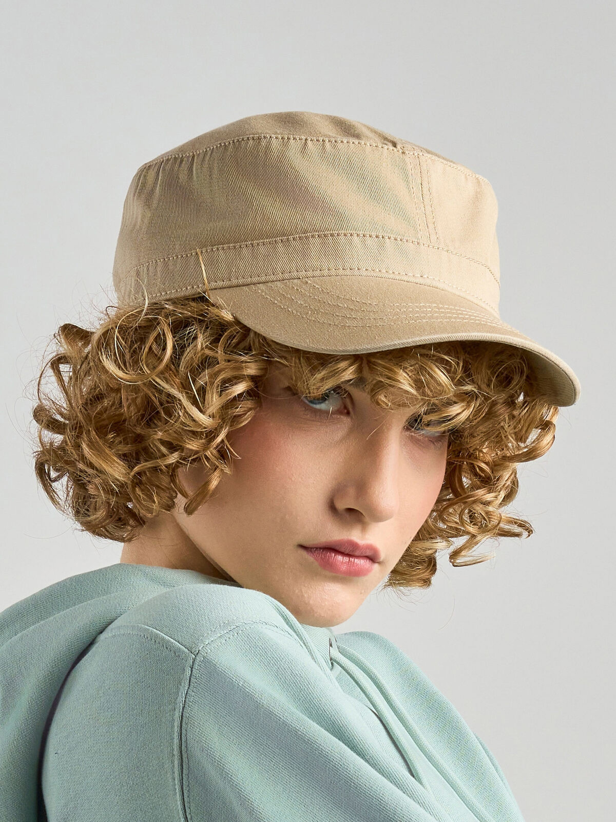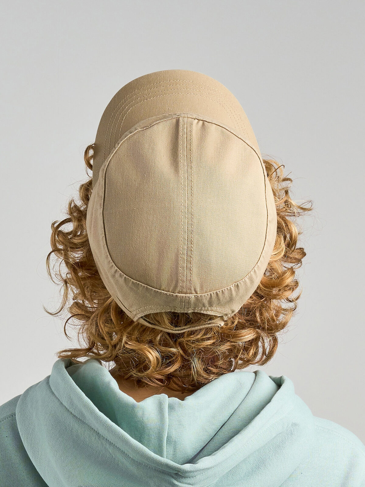 80% organic cotton, 20% recycled cotton. “Army” style hat, treated with a double washing process for softness, recycled plastic visor interior, hook-and-loop closure.