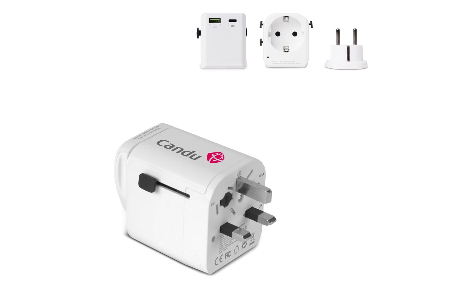 Ta kompakten, a robusten potovalni adapter (ki meri 70 x 50 x 60 mm in tehta le 156 g) je izdelan iz vzdržljivih ABS materialov. pametna, zelo uporabna izbira za obdarovanje na poslovnih dogodkih ali sejmih. Pakiran po 50 kosov na škatlo, zato je idealen za masovno promocijsko uporabo.