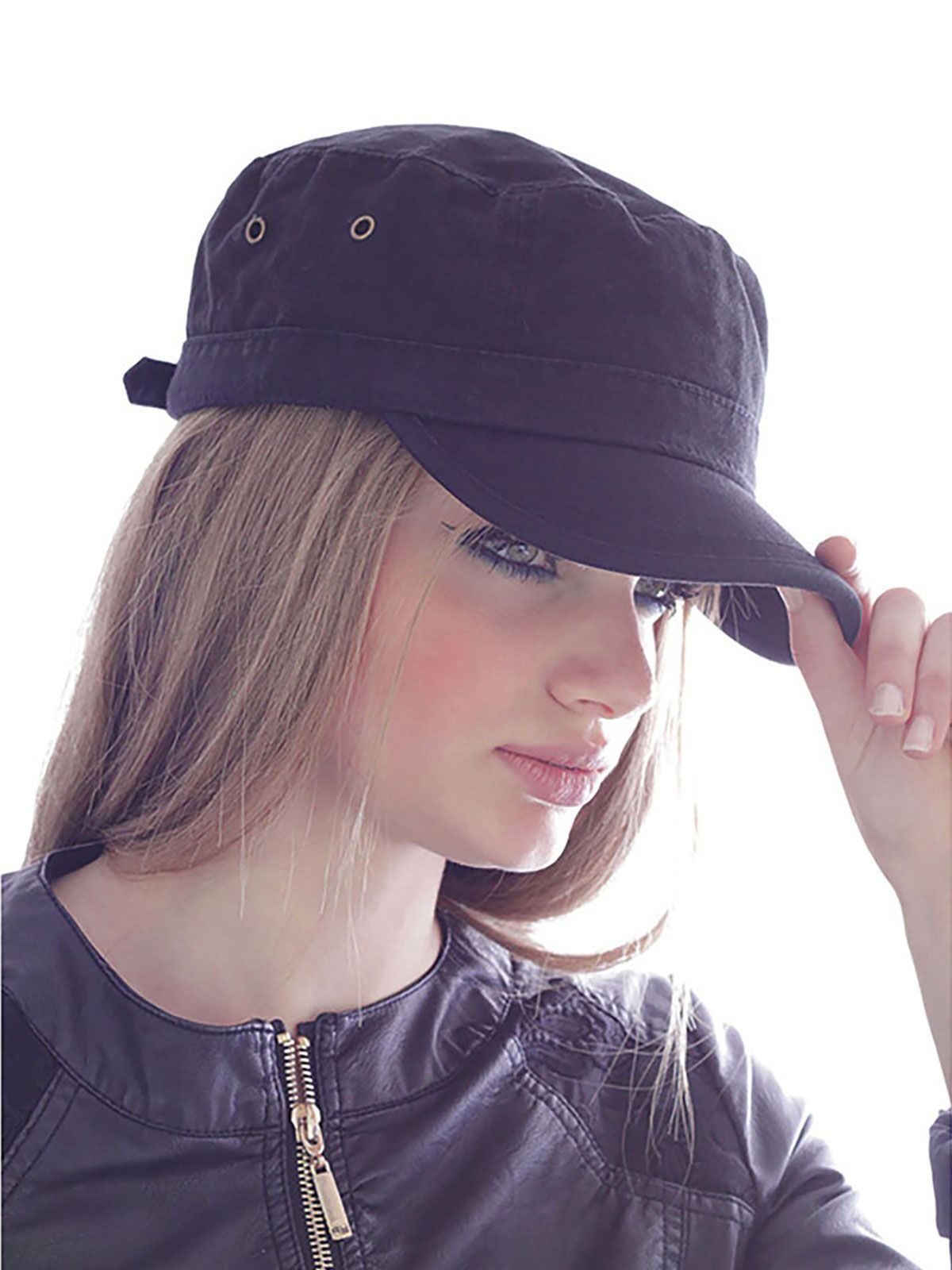 100% cotton. Army shape, metal eyelets, unstructured front panel, precurved visor, fully closed at rear, closure with metal buckle, garment washed, 1 stitching on visor, cotton sweatband, trim on bill. Removable label.