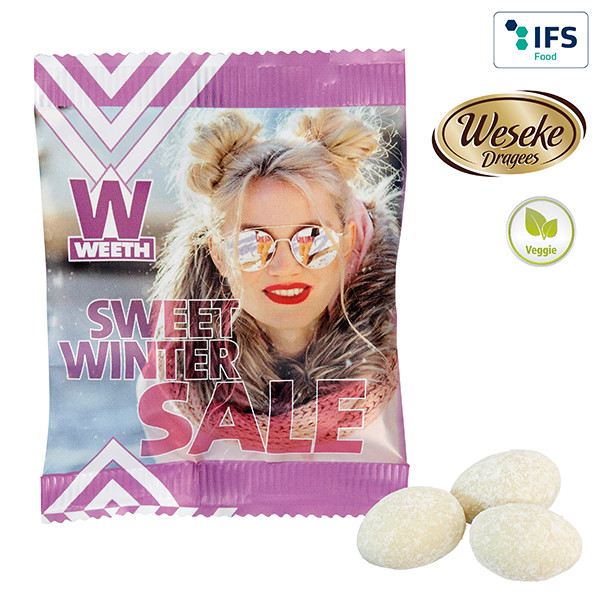 Finest almonds, coated with 74 % white chocolate with vanilla flavour, coverd with icing sugar, packed in a shiny or matt coated white bag.