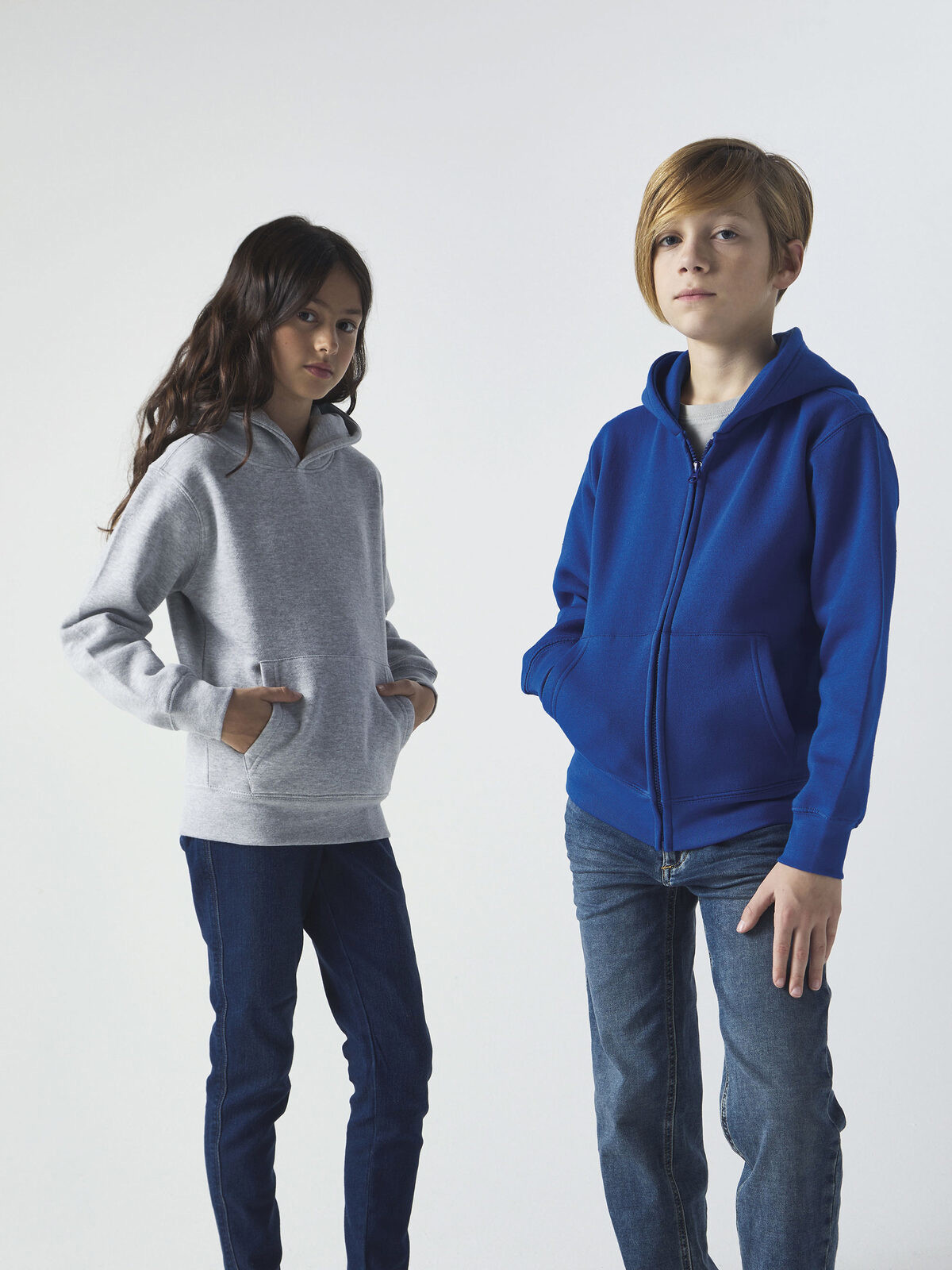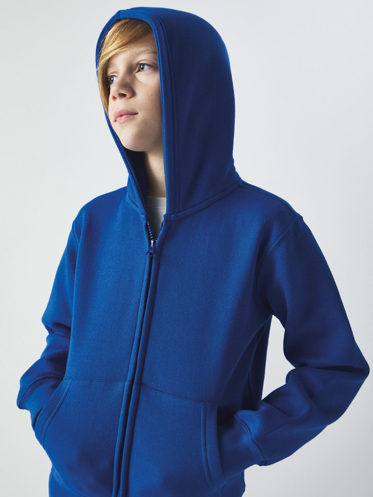 70% cotton 30% polyester. Children's sweatshirt with double-layer hood, fleece lining, set-in sleeves, tone-on-tone covered zipper, kangaroo pocket, ribbed hem and cuffs, side seams. 3-thread construction: 100% cotton exterior for excellent print quality, dimensional stability, and wash resistance. Tear-off label.