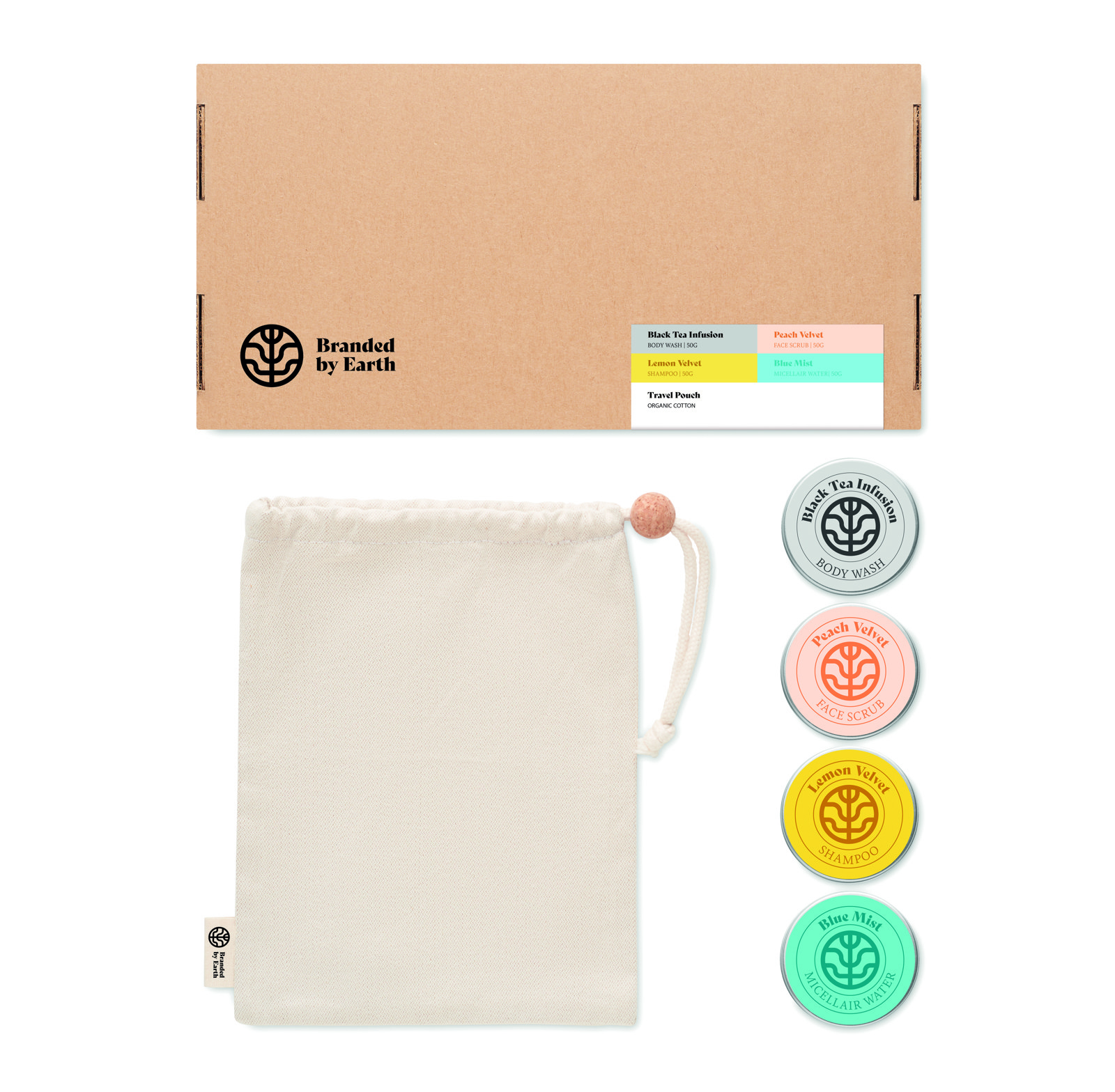 Presenetite svoje stranke, partnerje ali zaposlene z veganskim darilnim kompletom Travel Elegance – premišljeno izbranim uniseks potovalnim kompletom znamke Branded By Earth, ki združuje trajnost, uporabnost in slog. Ta eleganten komplet, oblikovan za ekološko ozaveščene popotnike, vključuje pomlajevalno 50-gramsko čistilo za telo, osvežujoč šampon, poživljajoč piling za obraz, micelarno vodico in praktično vrečko iz organskega bombaža — vse je priročno zapakirano v elegantno pločevinko za večkratno uporabo in v škatli iz recikliranega papirja.