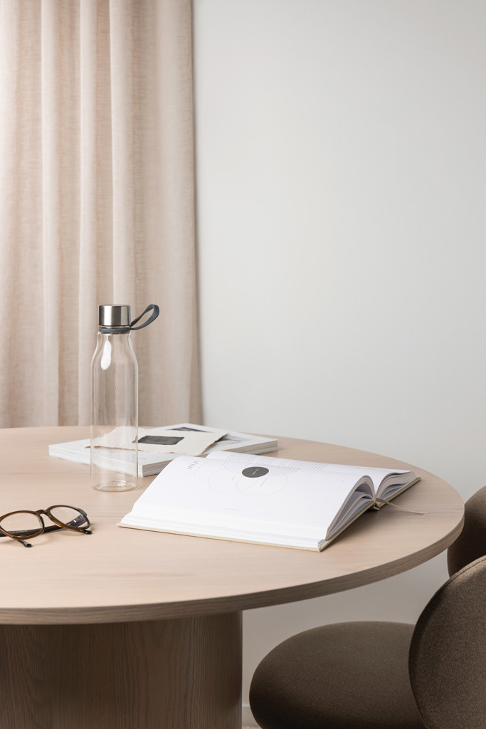 Plastenka, zasnovana za udobje, ima praktičen ročaj z zanko za enostavno prenašanje ali obešanje na telovadno opremo. Njegova elegantna valjasta oblika (premer 70 mm, višina 270 mm) se prilega večini avtomobilskih držal za skodelice – kot nalašč za prevoz v službo, potovanje ali telovadbo. Steklenica je zasnovana izključno za hladne pijače in jo je treba oprati le ročno, da ohranite njeno kakovost.
