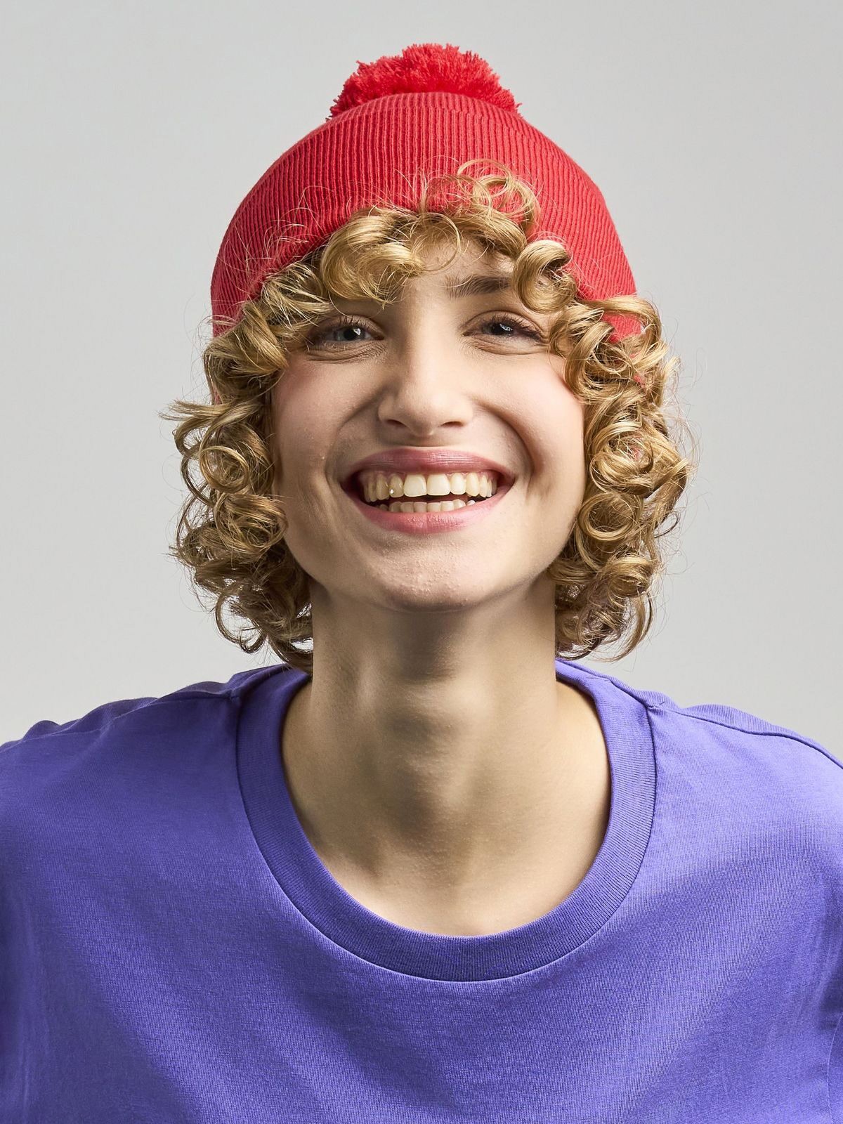 100% recycled polyester . Classic beanie with cuff and pompom on the top, made of recycled polyester.