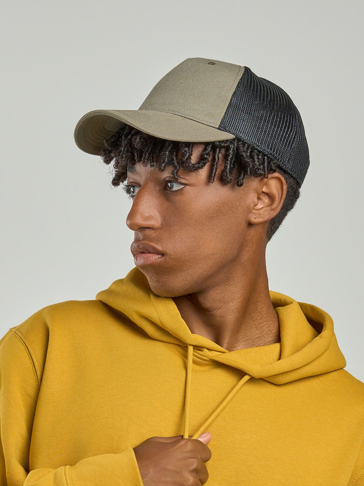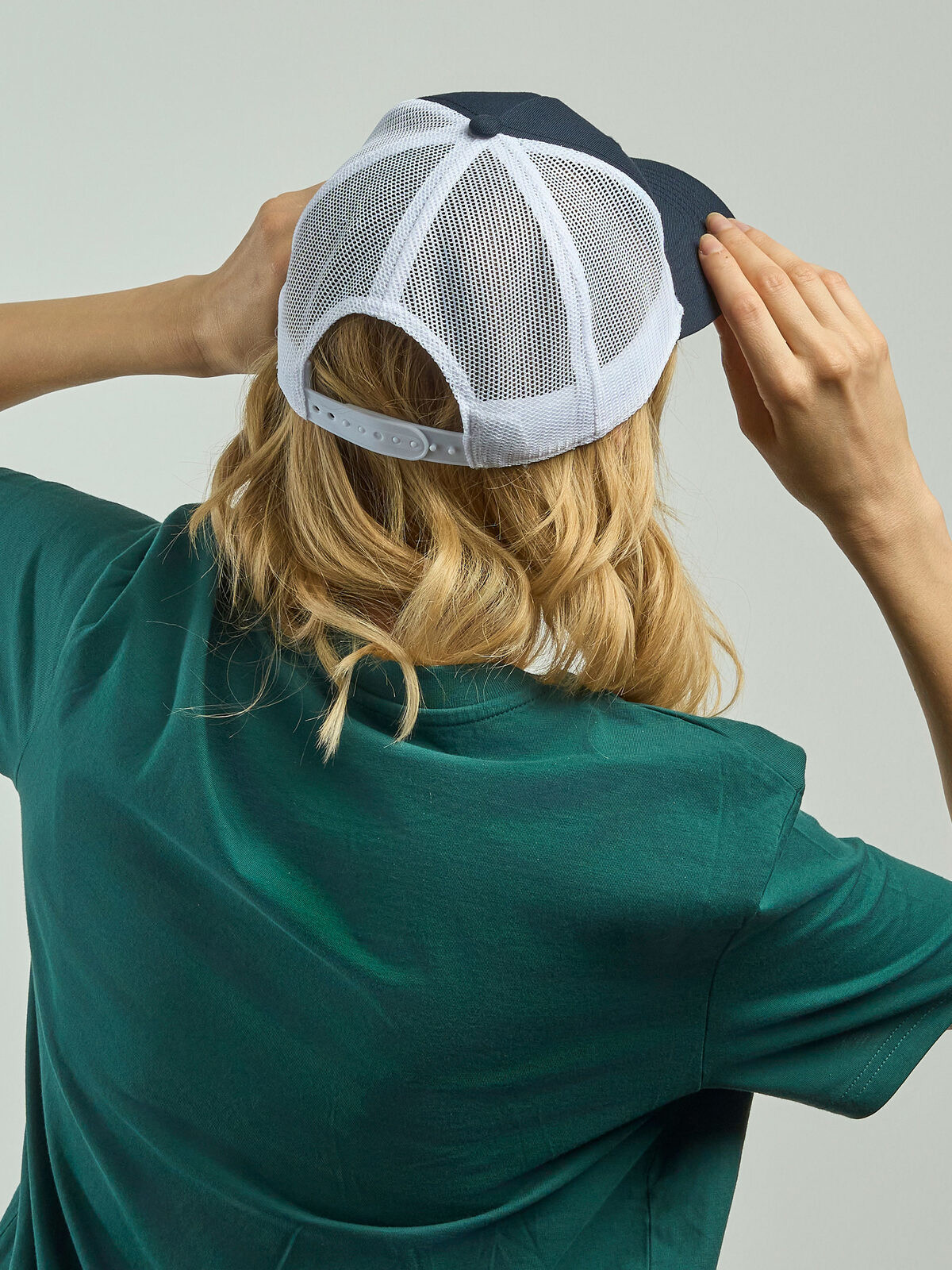 100% certified recycled polyester twill. Classic structured 5 panel trucker cap with recycled snapback closure. Removable label, perfect for customization.