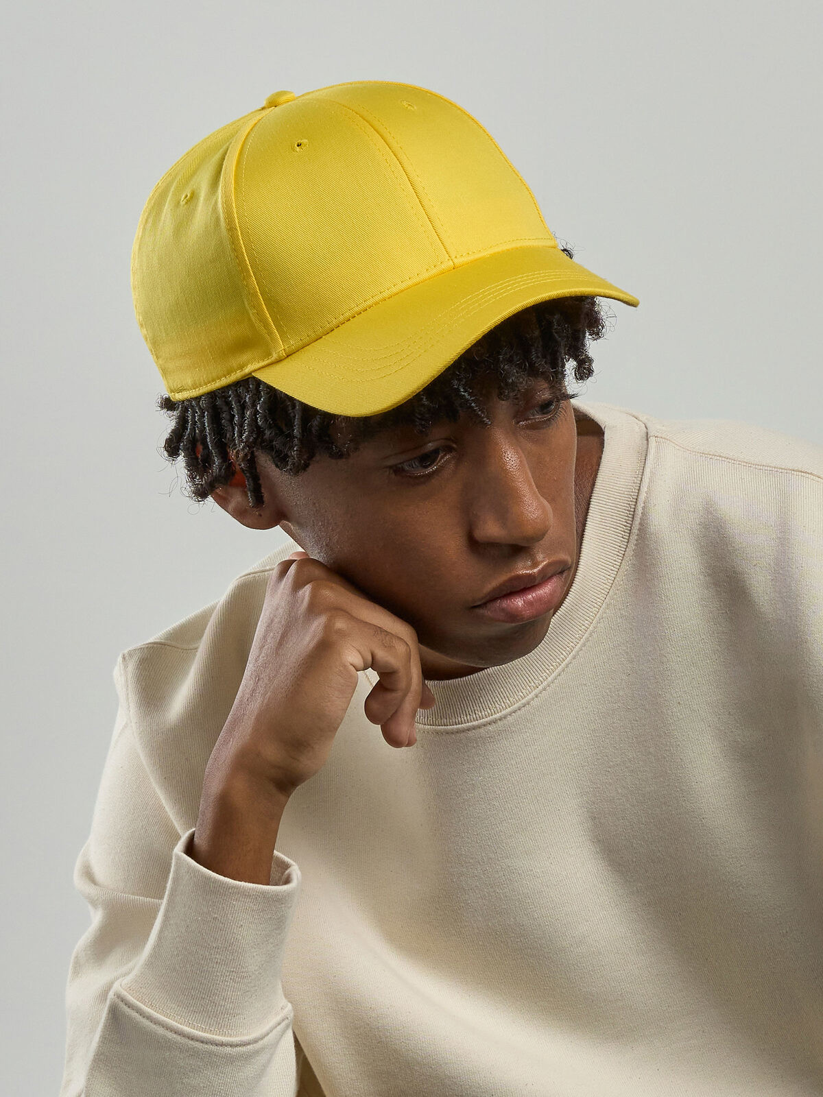 35% cotton, 65% polyester. 6 panels cap, velcro closure, sweatband, stitched eyelets, structured front panel, precurved visor, 4 stitchings on visor, one size fits all. Removable label.