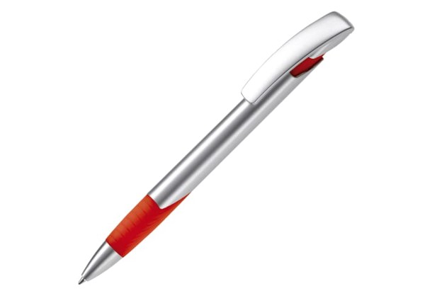 A Toppoint design modern ball pen. Unique design with silver parts and matt, metal tip. Coloured grip and spacer.