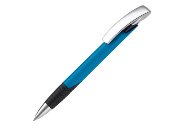 A Toppoint design modern ball pen. Unique design with hardcolour shaft and black grip. With a matt, metal tip and a silver clip.